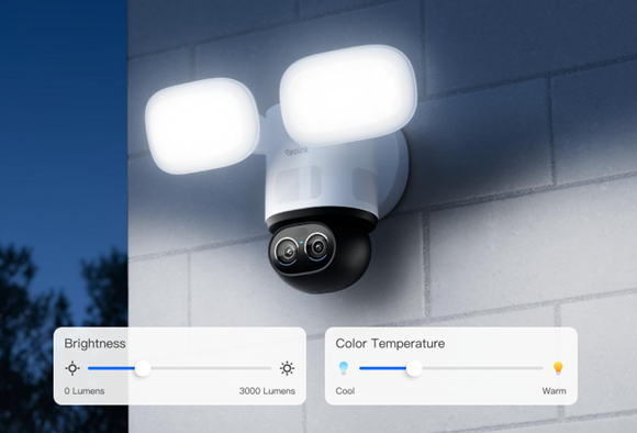 “High-performance LED floodlights deliver exceptional coverage with adjustable brightness reaching 3000 lumens and an impressive 40-foot range. Experience superior visibility and effective deterrence with your choice of lighting: warm 3000K for a welcoming atmosphere or crisp 6000K for maximum security clarity… this product makes light both a guardian and a companion,” reads the product guide.